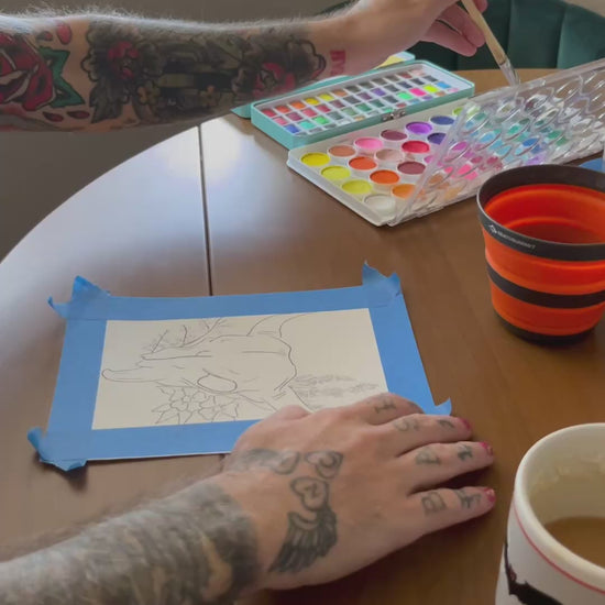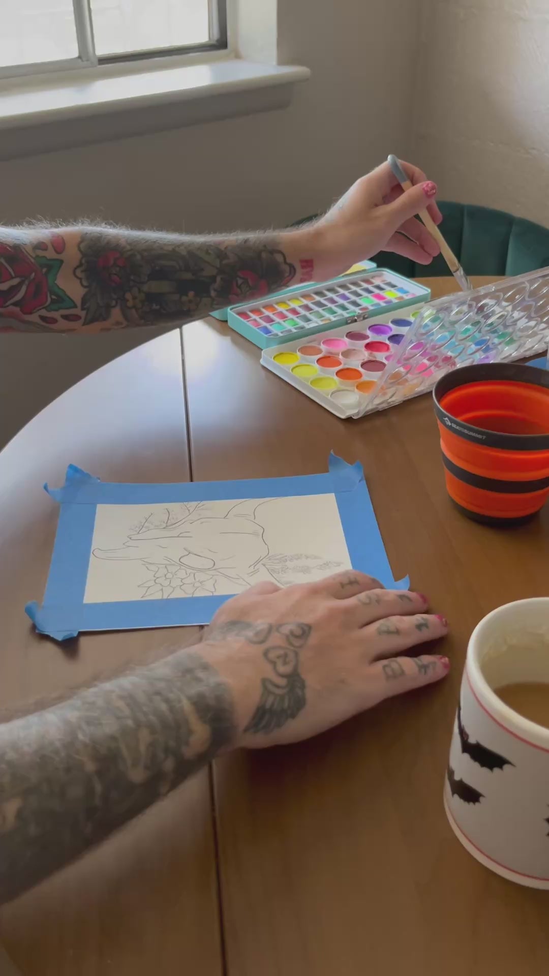 This 5x8 watercolor is a take on some prior skulls I’ve done, and a panting in my living room. It’s also featured on one of my sticker designs.