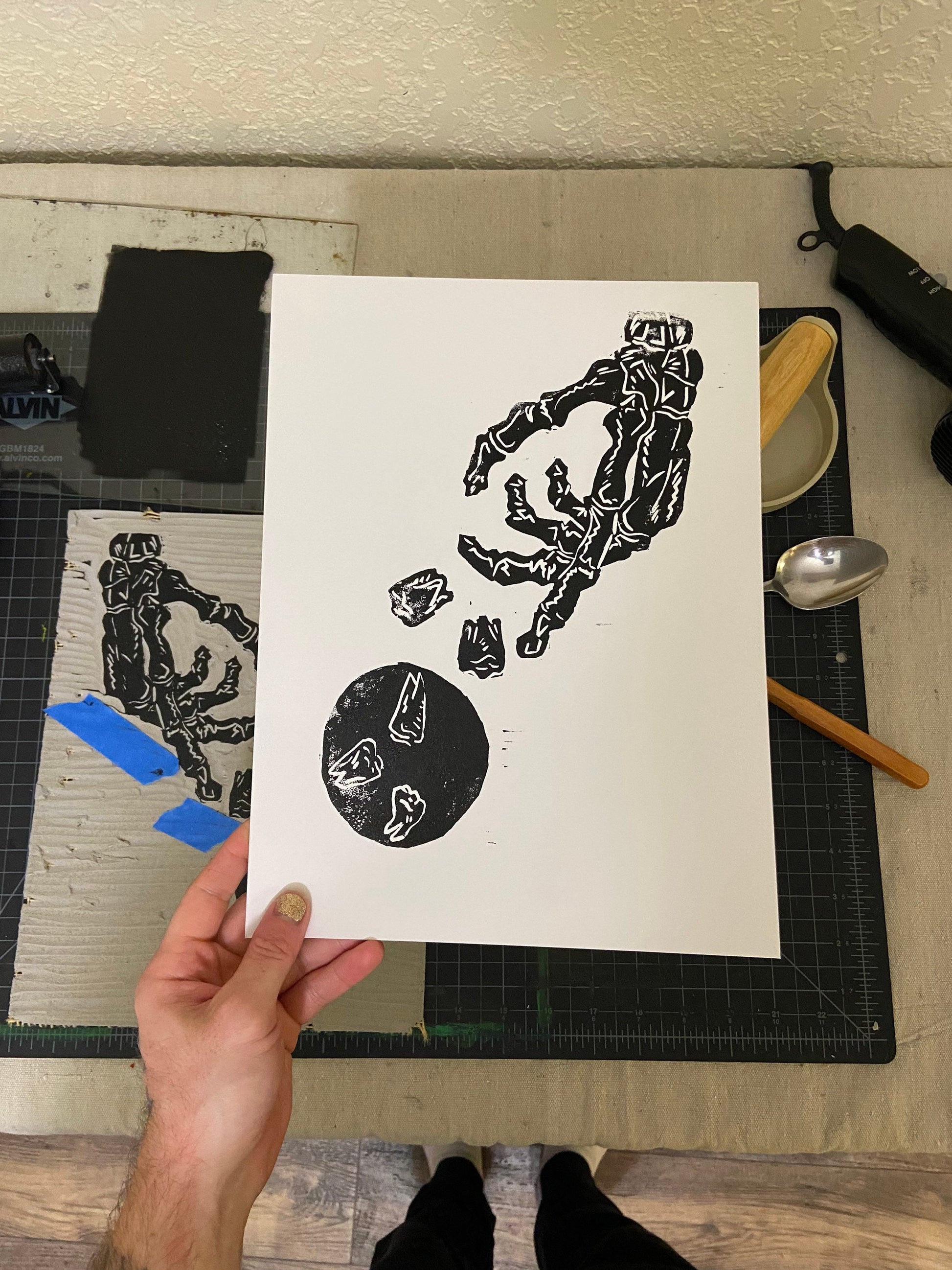 This print is so fun. Drawing it was a blast and I carved and printed it in a day because it was so fun.
