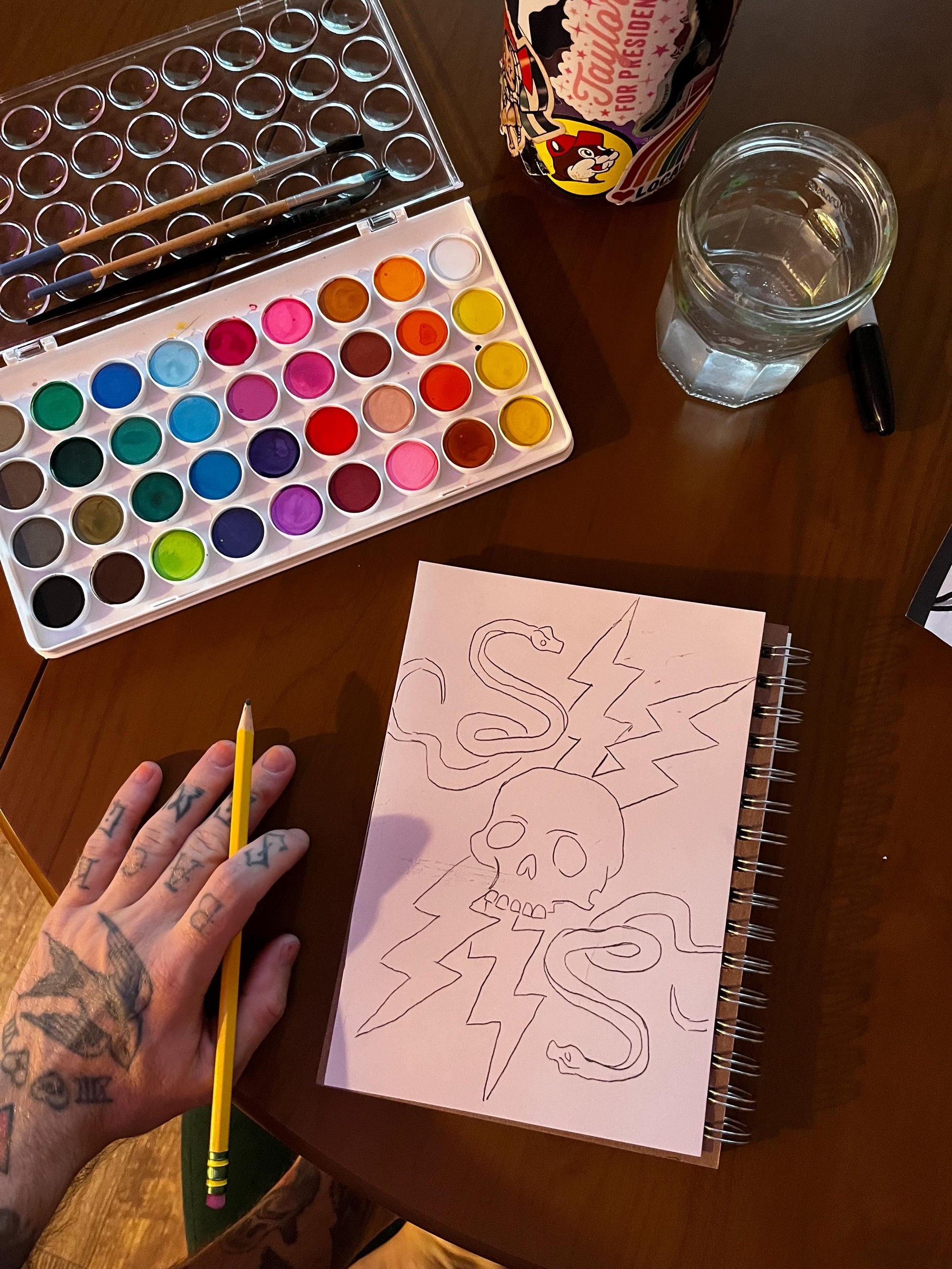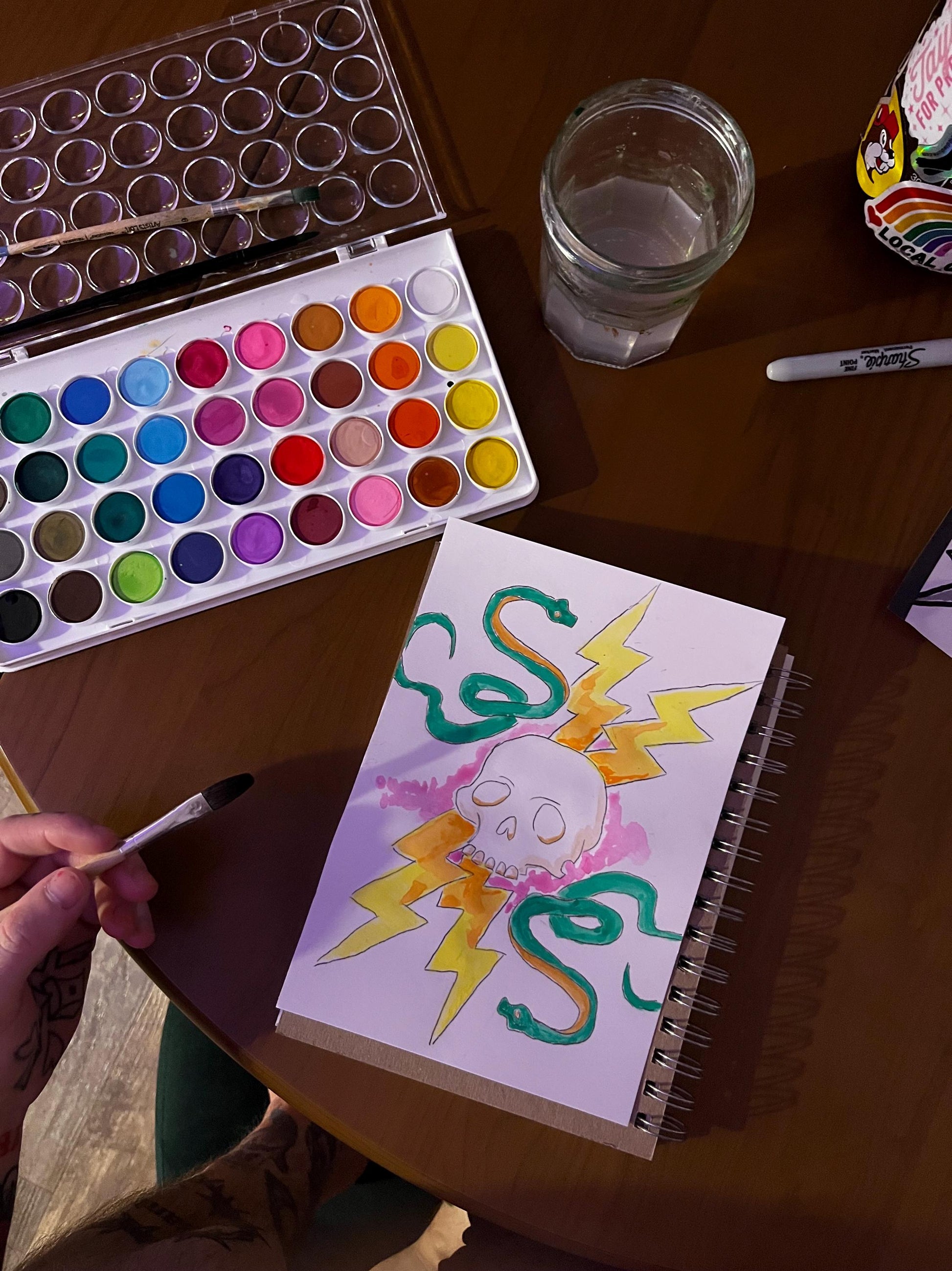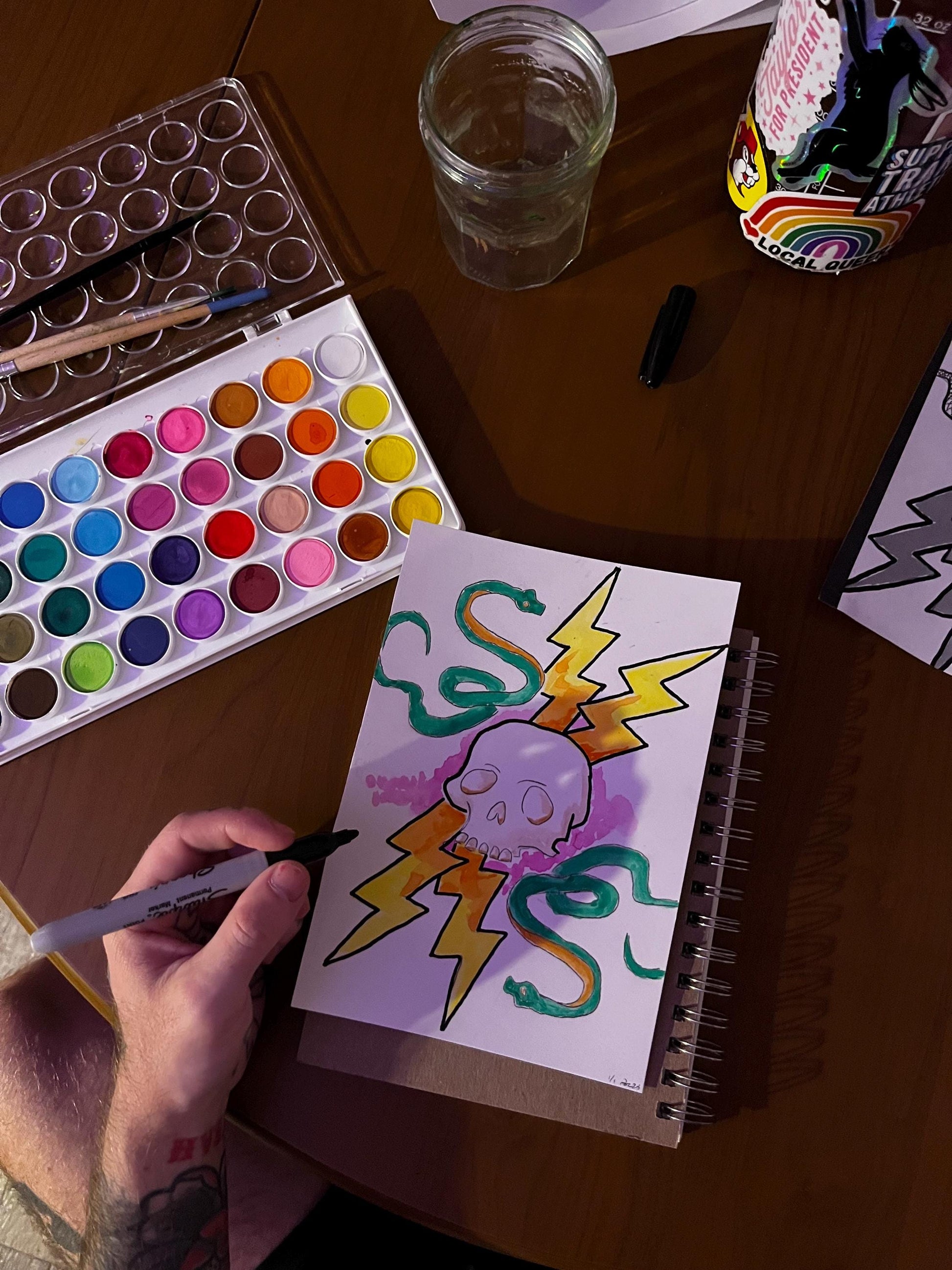 Skull, Snake and Lightning Watercolor, one of one.